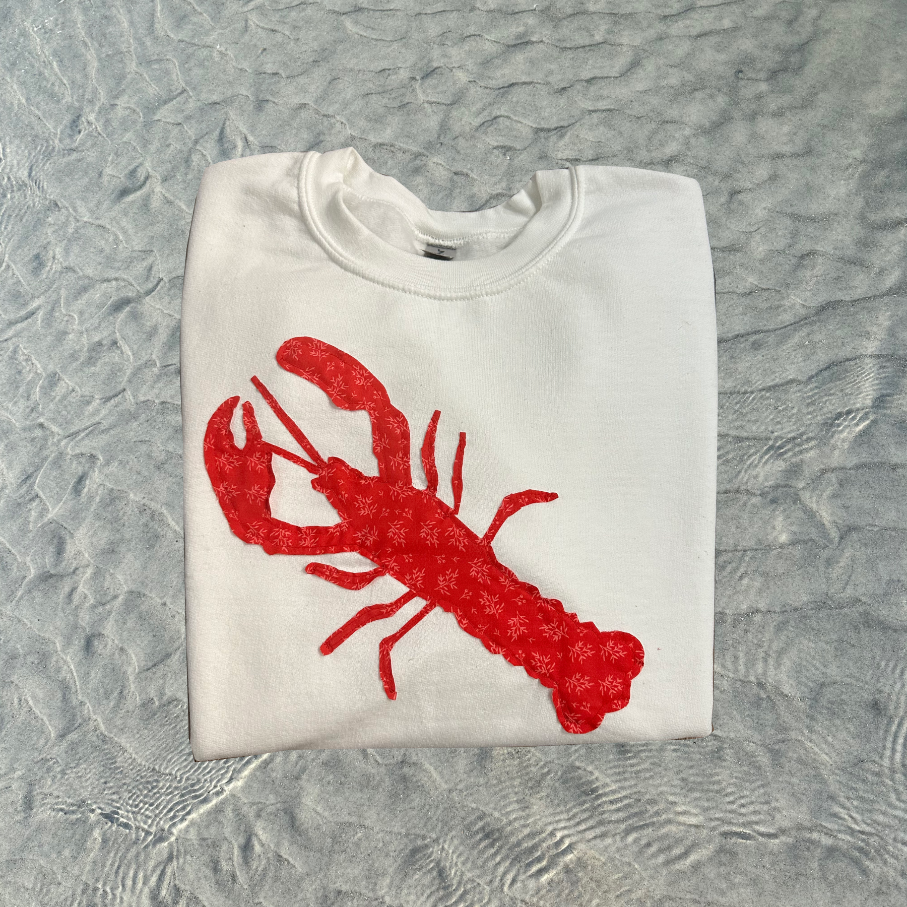 - Lobster hand-sewn on a Gildan sweatshirt